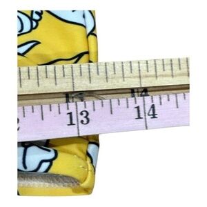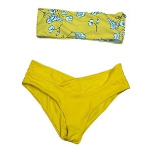 Includes bandeau top in yellow with blue and white floral pattern and high waist yellow bottoms with a slight V-front cut for a flattering fit.