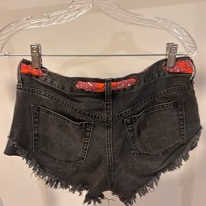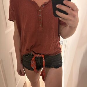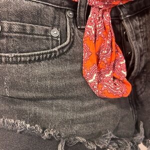 Chic black jean shorts with a red paisley tie. Perfect for casual style.