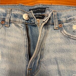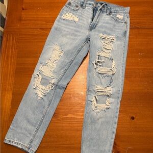 Trendy distressed jeans. Light blue wash. Perfect for casual wear.