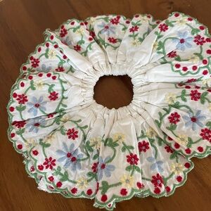 Pristine condition. Add a touch of elegance to your hairstyle with this floral embroidered hair scrunchie. Featuring a beautiful white base with colorful floral patterns, it's perfect for any occasion.