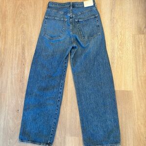 These are full-length jeans with an easy wide leg and a drawstring waist. They're made in LA from midweight organic cotton denim with a relaxed drape. This version comes in a medium indigo wash with fading and a finished hem.