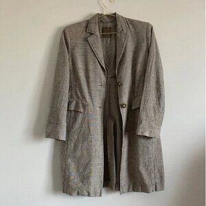 Crafted from a breathable linen and virgin wool blend, the fabric has a naturally slubbed weave that gives depth and character—an intentional finish, not a flaw. Fully lined for comfort, with clean lines and a longer length that feels modern and elegant without trying too hard.
