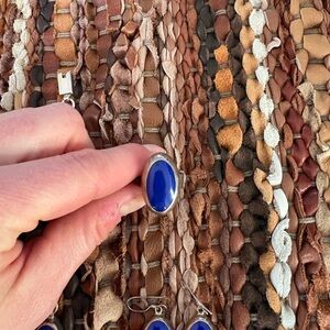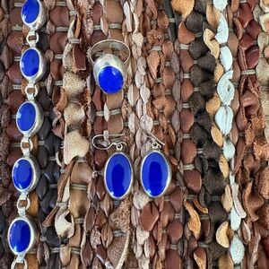 Beautiful set of sterling silver bracelet, ring and earrings with lapis blue cabochon set stones. I’m not sure if they are real stones or man made.