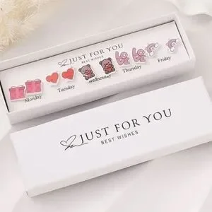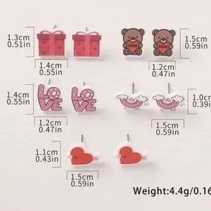 Adorable earring set for each day of the week. Features playful designs in pink and red. Perfect for adding a fun touch to your outfits.