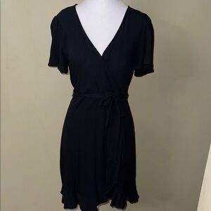 Chic black mini dress with a wrap design. Features a tie waist and ruffled hem. Ideal for versatile styling.