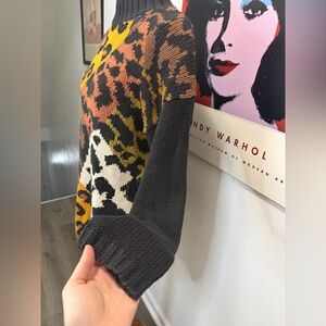 Vintage leopard print sweater dress with subtle sequin detailing woven through the front leopard design. Base color is black, with a solid black back for a sleek contrast. Long sleeves, soft knit feel, and a relaxed sweater-dress silhouette.