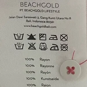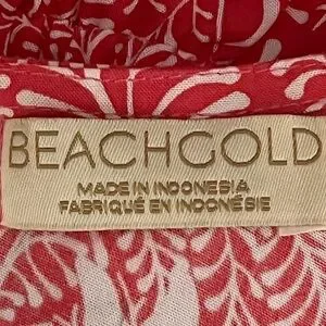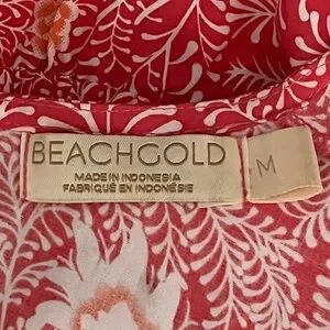 The image shows a red, shortsleeved romper with an all-over floral and leaf pattern in white and orange. It features a V-neckline with a small keyhole opening at the center, Front slant pockets an elasticized waist with a drawstring, tassels tie, and a relaxed fit in the shorts. The romper is made of a lightweight rayon flowy fabric, suitable for warm weather. Beachgold is known for its bohemian-style clothing, and this romper aligns with that aesthetic.