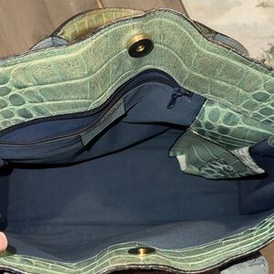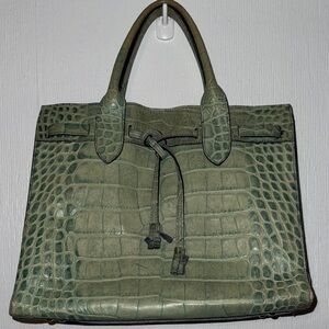 This stylish green tote bag features a sophisticated crocodile-embossed design. Perfect for adding a touch of elegance to any outfit. Flaws conclude the scuffs around the corners and moderate wear on the handles with loss of color mainly where the hand would go. Interior looks to be great shape and clean. Some of the fringes on the tassels are bent and torn. Measurements are approximately 12.75“ x 10.25“ x 4.5“ with a strap drop of 5”.