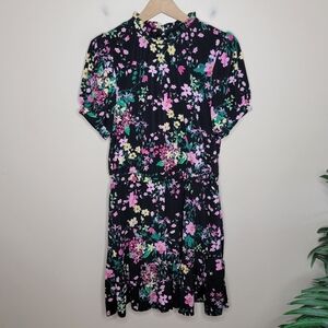 Beautiful colorful floral print short sleeve dress with a high neck ruffle collar & hem, slightly puffed shoulder, and elastic waist.