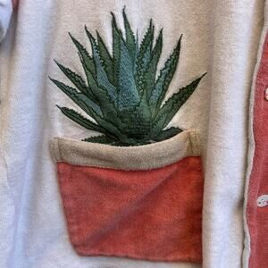 Tombolo terry cloth button up featuring bold colorblocking with embroidered agave plant and tequila bottle patch details. Soft towel-like fabric with a relaxed camp shirt vibe that feels very Palm Springs resort and summer cocktail coded. Size mens XXL.