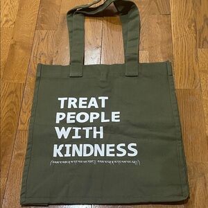 Stylish Tibetan Buddhism green tote bag featuring 'Treat People With Kindness' text. Perfect for everyday use.