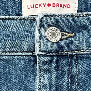 Details: Classic five pocket styling with front scoop pockets and coin pocket, back patch pockets, belt loops around waistband, zip fly with logo button closure, leather Lucky Brand logo patch at back waist, raw frayed hem, front seaming and panel construction that creates a flared A-line shape