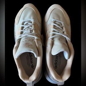 Elevate your look with these Adidas sneakers. Cream and gray tones for a modern touch. Ideal for casual wear.