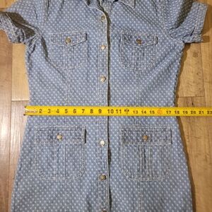 I accept all REASONABLE offers! NO FLAWS JUST LIGHT WEAR. Elegant midi dress with a subtle pattern. Features button-up front and short sleeves. Ideal for versatile styling.