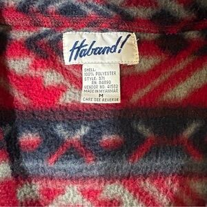 Vintage Haband fleece jacket featuring a bold Aztec/tribal-inspired print in red, blue, and gray tones. Soft and cozy fleece with a classic vintage fit—perfect for layering, casual wear, or adding a retro statement to your outfit.
