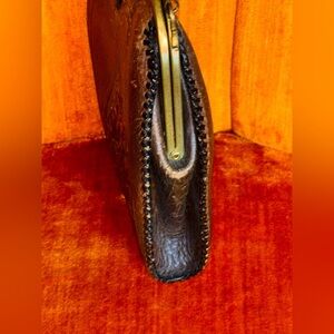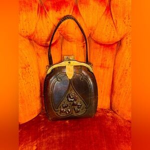 This is a beautifully made Art Nouveau hand tooled leather purse by Justin Leather Goods. This style is characterized by its flowing, organic lines and motifs inspired by nature, such as the intricate floral design seen on the front of the purse. The bag is made of hand-tooled leather and features a metal frame and a turn-lock clasp. A beautiful Spanish Design rose theme adorns the front of the bag. The clasp is a gold rose design, which you have to turn counter wise to open it up. The inside is made from green suede, and has two small pockets. Made by Justin Leather Goods in the 1920s, the purse is in great condition with only a few minor scuffs on the front and back.