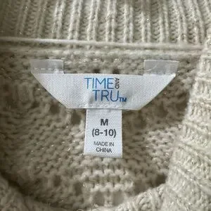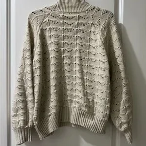 Stay warm and stylish with this cozy cream knit sweater. Perfect for layering in cooler weather. With a golf foil type thread going throughout sweater