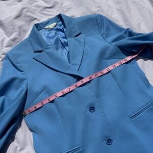 Classic and timeless vintage Austin Reed blazer in a gorgeous powder blue shade. Designed with light shoulder padding for added shape and structure. Features a sleek, tailored silhouette with faux front pockets and a smooth satin lining for extra comfort. Perfect for elevating your office look or layering over casual outfits for a chic, retro vibe.