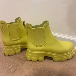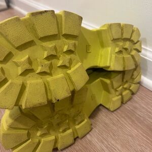 Bold yellow boots with chunky soles. Ideal for winter weather.