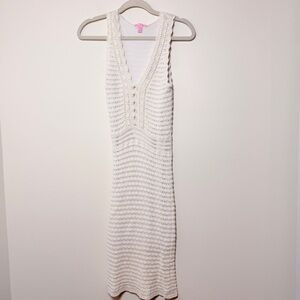Elegant white sleeveless knit dress with a V-neck design. Perfect for casual outings or summer events.