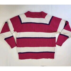 This is a vintage 1980s or 1990s v-neck women's size medium pink and white striped knit sweater from Sky Blue Waters. Made of acrylic in Korea. It is in excellent condition. Measurements included in photos.