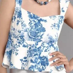 🏷️ NWT - ANTHROPOLOGIE Maeve Blue Floral Square-Neck Peplum Tank Top in Sz LARGE