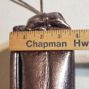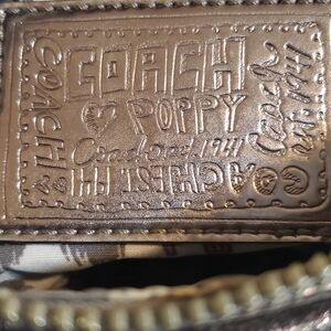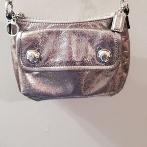 Elegant Small Coach crossbody in a stunning Mettalic pewter finish. Features a sleek design with button accents. It has a Mettalic pink shade to it. Ideal for day or night outings. In good shape. Does have light discoloration on inside fabric from zipper. See last photo. No other marks or stains inside or out. Measurements in pictures.