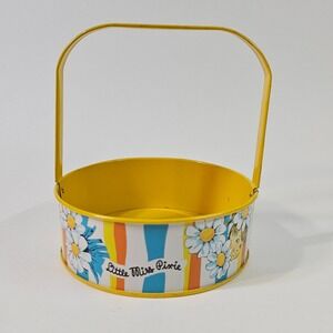 A charming Little Miss Pixie tin bucket adorned with a cheerful pattern of daisies and colorful vertical stripes. This small pail features a bright yellow interior and a coordinating yellow wire handle, perfect for holding small treasures or decorative accents. The 'Little Miss Pixie' branding is clearly visible along with a sweet illustration.