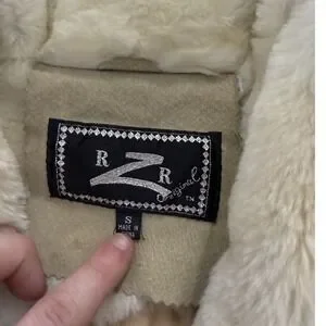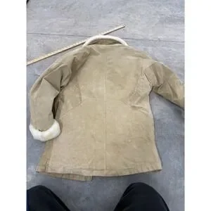 Keywords: suede coat, faux fur, vintage fashion, cozy outerwear, winter jacket, tan coat, statement piece, retro style, chic, elegant, warm, fashionable
