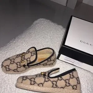 feature the iconic interlocking G monogram pattern in beige and black, a gold-toned horsebit detail across the vamp, and black piping around the edges. They often have a soft merino wool or shearling lining for comfort and warmth.
