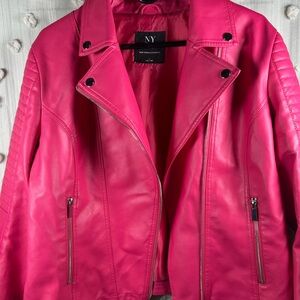 Add a pop of color and boldness to your wardrobe with this hot pink faux leather jacket with sleek zippered pockets from New York & Company. Perfect for a classic, stylish look. Great pre-owned condition, with one small mark on front, as shown in last photo. Women’s size large.