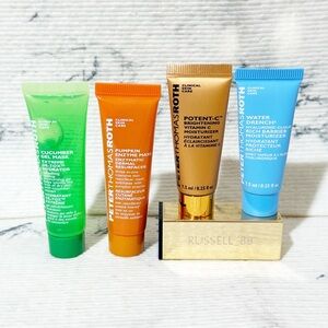 Four skincare products from Peter Thomas Roth. Includes Cucumber Gel Mask, Pumpkin Enzyme Mask, Potent-C Moisturizer, and Water Drench Moisturizer. Colorful packaging in green, orange, gold, and blue.