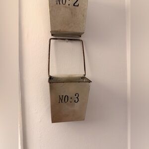 Set of three vintage-style galvanized metal wall bins with wire hanging handles and black stenciled numbers. Each bin has a naturally aged patina, giving them wonderful farmhouse and industrial character.