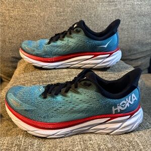 Hoka One One Clifton 8 Teal and Red Athletic Shoes Size 10.5