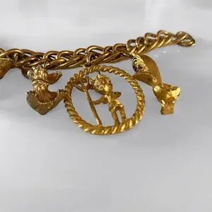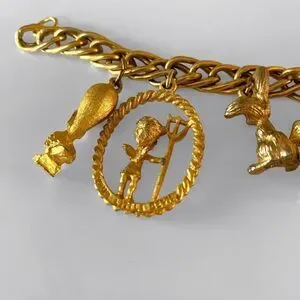 Gold chain link charm bracelet with 5 charms… fallen angel, wishing well, rabbit, little devil, and a bird? Some minor wear as shown. The little devil charm is missing an arm and a rhinestone on one of his eyes. Has fold over clasp for closure. Measures 7” in length