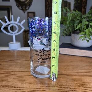 Honour the memory of a loved one with this stunning memorial hurricane glass vase. This piece features a vibrant, wrap-around design of purple wisteria, a graceful hummingbird, and delicate butterflies. The center is inscribed with the heartwarming sentiment: "Your Life gave us memories too Beautiful to forget."