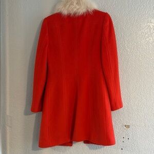 This pea coat combines a vibrant red and cream color palette with a classic tailored silhouette, perfect for cold-weather elegance. The structured design and luxurious material make it an ideal choice for formal occasions, ensuring both warmth and style.