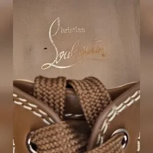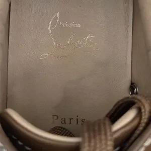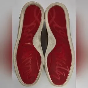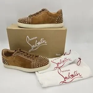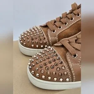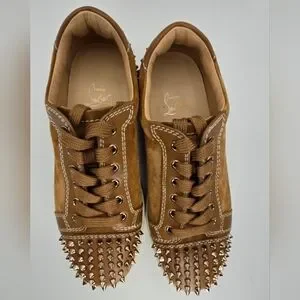 Step out in style with these Christian Louboutin Louis Junior Spikes Low-Top Suede Sneakers in Lionne Matt (brown). Featuring a spiked design and signature red bottom soles, these shoes offer both luxury and edge. Perfect for making a statement. Comes with 2 dust bags, box (not original) and COA.