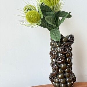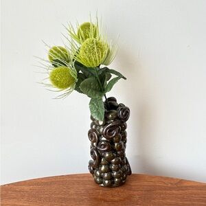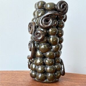 Artistic vase with a unique bubble texture. Features a glossy dark finish. Signed.