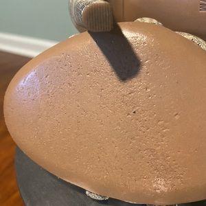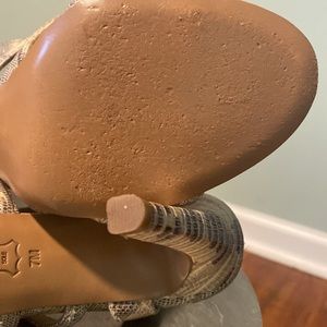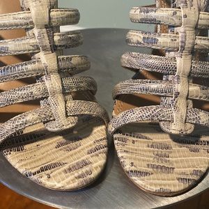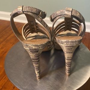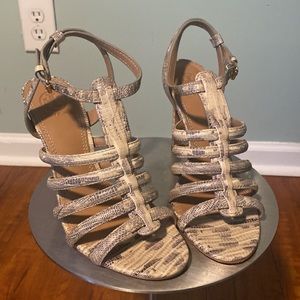 TORY BIRCH LEATHER ANIMAL PRINT GLADIATOR SANDALS, NEUTRALS, ANIMAL PRINT, STILETTO HEELS, STRAPS & BUCKLE CLOSURE AT ANKLES, HERL-4.75”, GREAT CONDITION