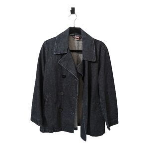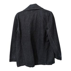 Classic dark blue jean jacket. Features button closure and pockets. Casual and stylish.