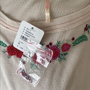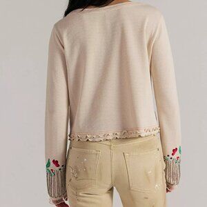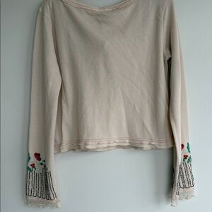 Top off your look with this sweet long sleeve, featured in a cropped, flowy style and thermal fabrication with a flattering boat neckline, lettuce trim, and so-special beading and embroidery. Color is Tea. Size S. Very pretty top!
