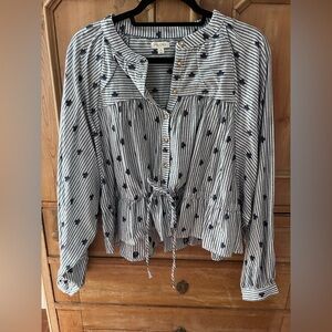 Chic Pilcro blouse with navy patterns on white. Button-down style with a drawstring waist. Ideal for casual outings.