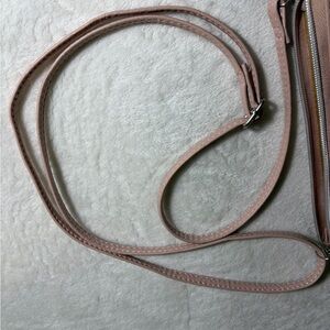 Chic blush crossbody bag with textured design. Ideal for everyday use. Features adjustable strap and secure zip closure.