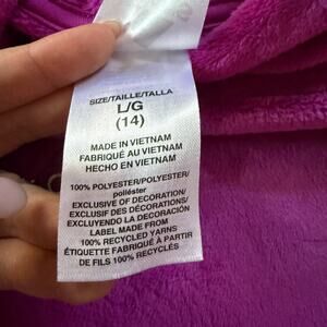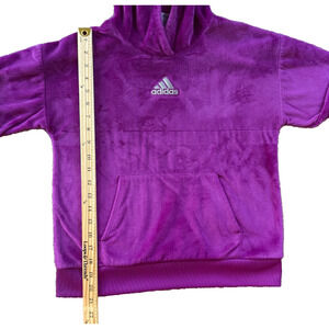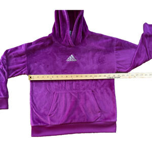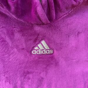 Adidas youth girls velour hoodie sweatshirt in size 14 featuring a super soft plush feel and classic pullover style. Rich purple color with embroidered Adidas logo, kangaroo pocket, and cozy hood. Made from 100% polyester. Excellent condition. Perfect for casual wear, lounging, or layering.