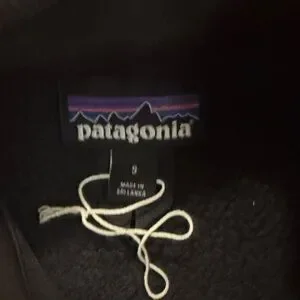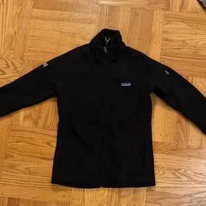 Cozy black fleece jacket with full-zip closure. Features Patagonia logo on chest. Never worn