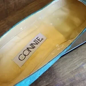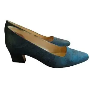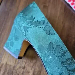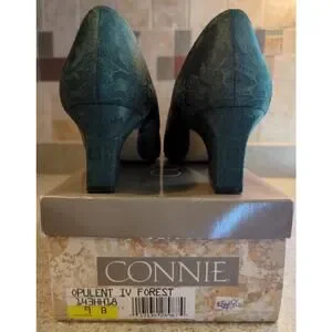 Connie Opulent IV Forest Green Patterned Fabric 2.25" Heels vintage women's Sz 9