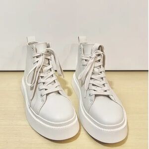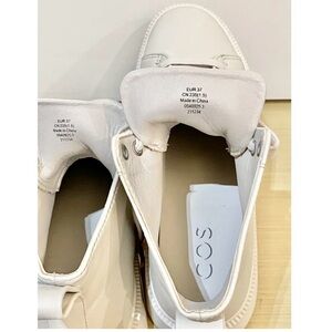 COS Ivory Leather Platform High-Top Sneakers - Size 7 Description Elevate your street style with these minimalist COS high-top sneakers. Crafted from premium ivory leather, these sneakers feature a sleek tonal design and a chunky platform sole for a modern, architectural look. The clean lines and monochromatic palette make them an incredibly versatile staple for any contemporary wardrobe. Details: • Brand: COS • Size: US 7 / CA 7 • Color: Ivory / Off-White • Material: Genuine leather upper and lining with a durable rubber platform sole • Style: Lace-up high-top sneaker with a reinforced platform base • Features: Tonal laces, metal eyelets, and a convenient leather pull-tab at the heel • Condition: Great pre-loved condition with gentle wear as shown in photos ✨ Special Offers ✨ • Bundle & Save: Enjoy a 25% discount when you purchase 3 or more items from my closet! 💖✨ • Sustainability Matters: Choosing quality second-hand footwear is a stylish way to support a more circular fashion economy. 🌎 • Offers Welcome: I’m always happy to consider reasonable bids and offers! 💸 #Hashtags #COS #LeatherSneakers #HighTop #PlatformSneakers #MinimalistStyle #IvorySneakers #ModernStreetwear #ContemporaryFashion #Size7 #SustainableStyle