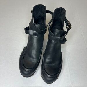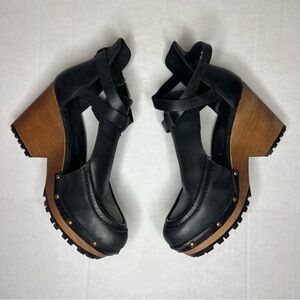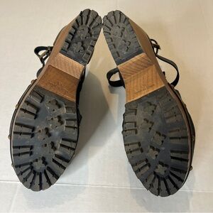 Features: Ankle length, leather fabrication, round toe, raised mocc seams, cutout details, ankle backing, criss-cross adjustable ankle strap, stud details, pine wood platform sole, chunky wedge heel, tread outsole