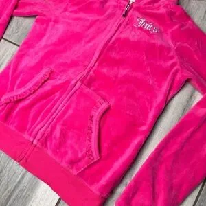 Girls Juicy Couture Pink Velour Zip Up Jacket With Hood Dog Print on Back 8-10